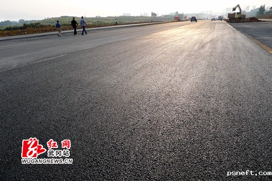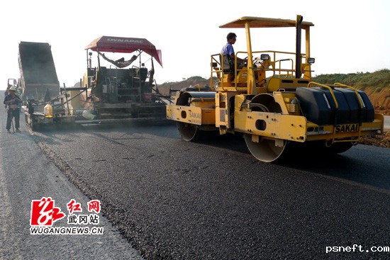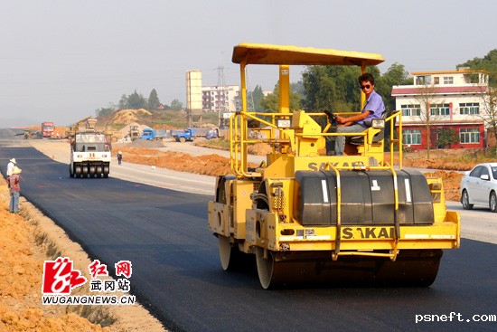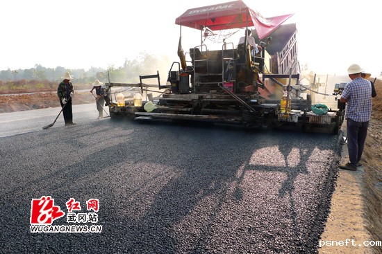 10月7日下午,在洞新高速武冈东连接线拓建工地上,工人们正在摊铺油路。国庆长假期间,武冈各重点项目建设不停工,施工方抢抓晴好天气加快项目进度,力争超额完成年度建设目标任务。