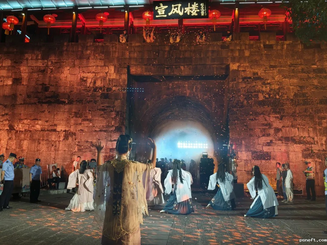 夜幕低垂,华灯初上,武冈古城在璀璨光影中焕发新生。游客们携带古风福牌(书签)和一个装有仿古“银票”的福袋,作为穿越之旅的信物。随着悠扬的钟声响起,城门缓缓开启。盛唐诗人“王昌龄”手持折扇,吟诵着“沅水通波接武冈”的诗句,带领游客踏入古城。光影交错间,宣风楼外仿佛时空转换,游客们瞬间“穿越”回武冈千年前的繁华盛景。