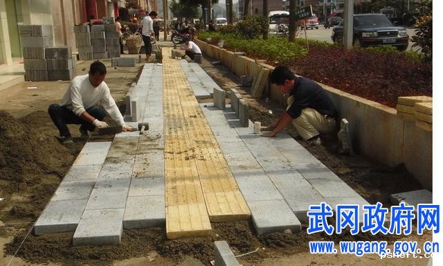 为深入学习科学发展观,让盲人市民有一个舒适安全的行走通道,点点体育app官网入口下载委市政府加大对市政建设的投入,首次在点点体育app官网入口下载区的主要街道武强路铺设盲人行人道。图为施工人员正在武强路铺设盲人行人道时的情景。