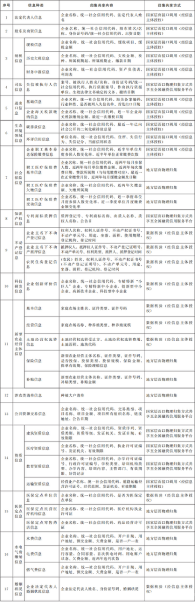 (四)明确信用信息归集共享范围。根据金融机构对信用信息的实际需求,进一步扩大信用信息归集共享范围,将企业主要人员信息、各类资质信息、进出口信息等纳入信用信息归集共享清单(见附件),国家发展改革委牵头适时对清单进行更新。各地区要充分发挥地方融资信用服务平台作用,进一步破除数据壁垒,依法依规加大清单外信用信息归集共享力度,结合本地区实际编制省级信用信息归集共享清单,有效拓展数据归集共享的广度与深度。